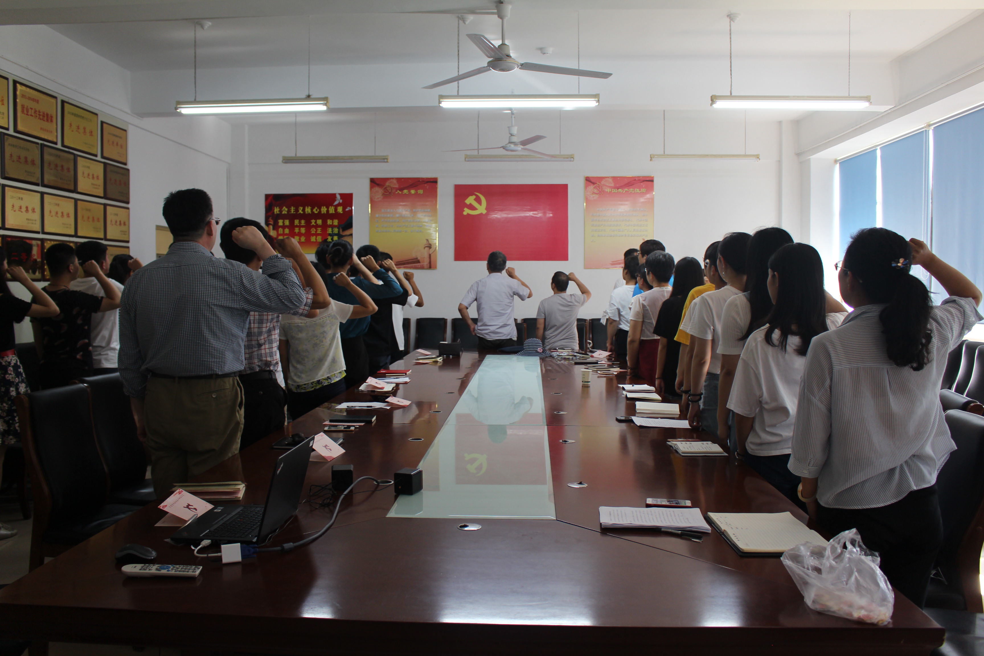 接着,由教师党员给全体毕业生党员佩戴党徽,同时赠送毕业寄语与纪念礼品,拉进了学生与教师之间的距离,让毕业生党员深切感受到学院党总支的关怀。在鲜红的党旗下,全体党员佩戴党徽,举起右手、握紧拳头,庄严宣誓,重温入党誓词,在党旗下接受心灵的净化和洗礼。