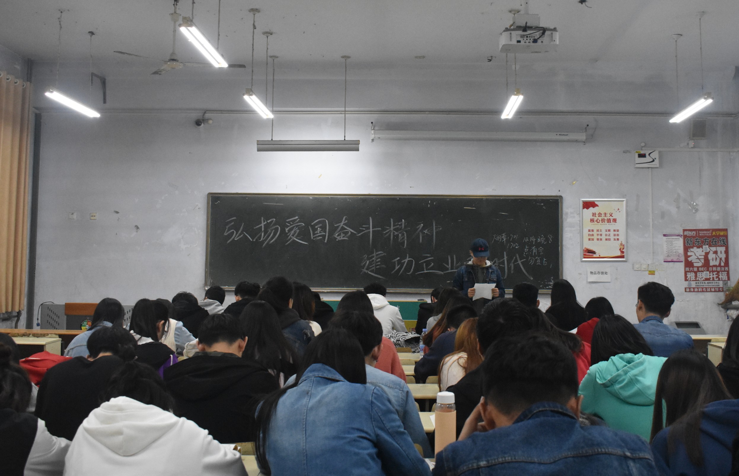 为深入贯彻落实习近平总书记对广大青年提出的希望与要求,增强同学们的爱国情怀,争做新时代新青年,10月14日,新葡萄8883官网amg于教学区开展"弘扬爱国奋斗精神,建功立业新时代"主题团课教育,2017、2018级全体同学积极参加。