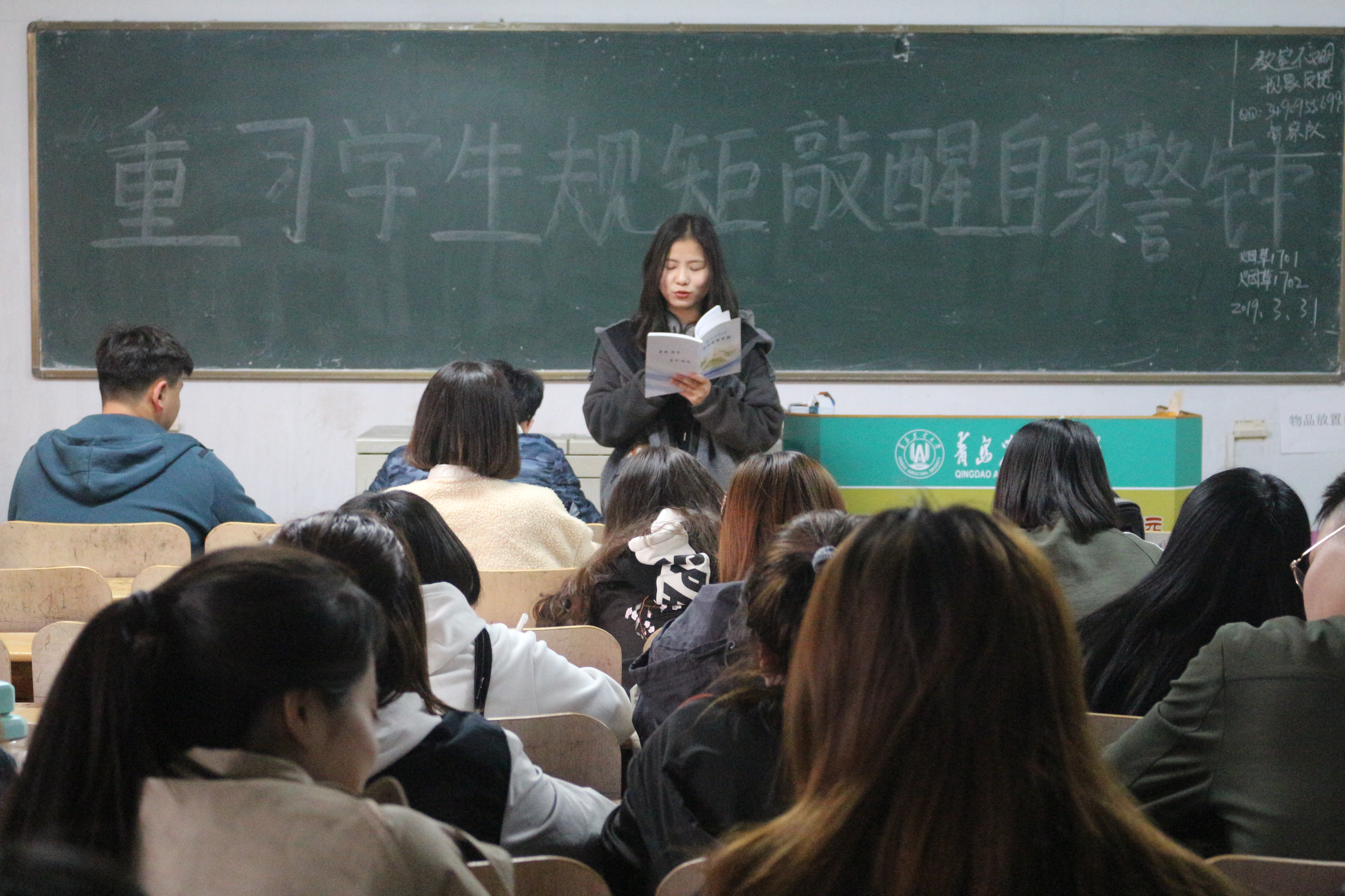 3月31日,新葡萄8883官网amg于教学区开展“重习学生手册,敲醒自身警钟”主题团课,旨在规范学生日常行为,进一步加强院纪和院风建设,增强新葡萄官网学生学习的积极性和自主性。2017、2018级全体团员积极参加。