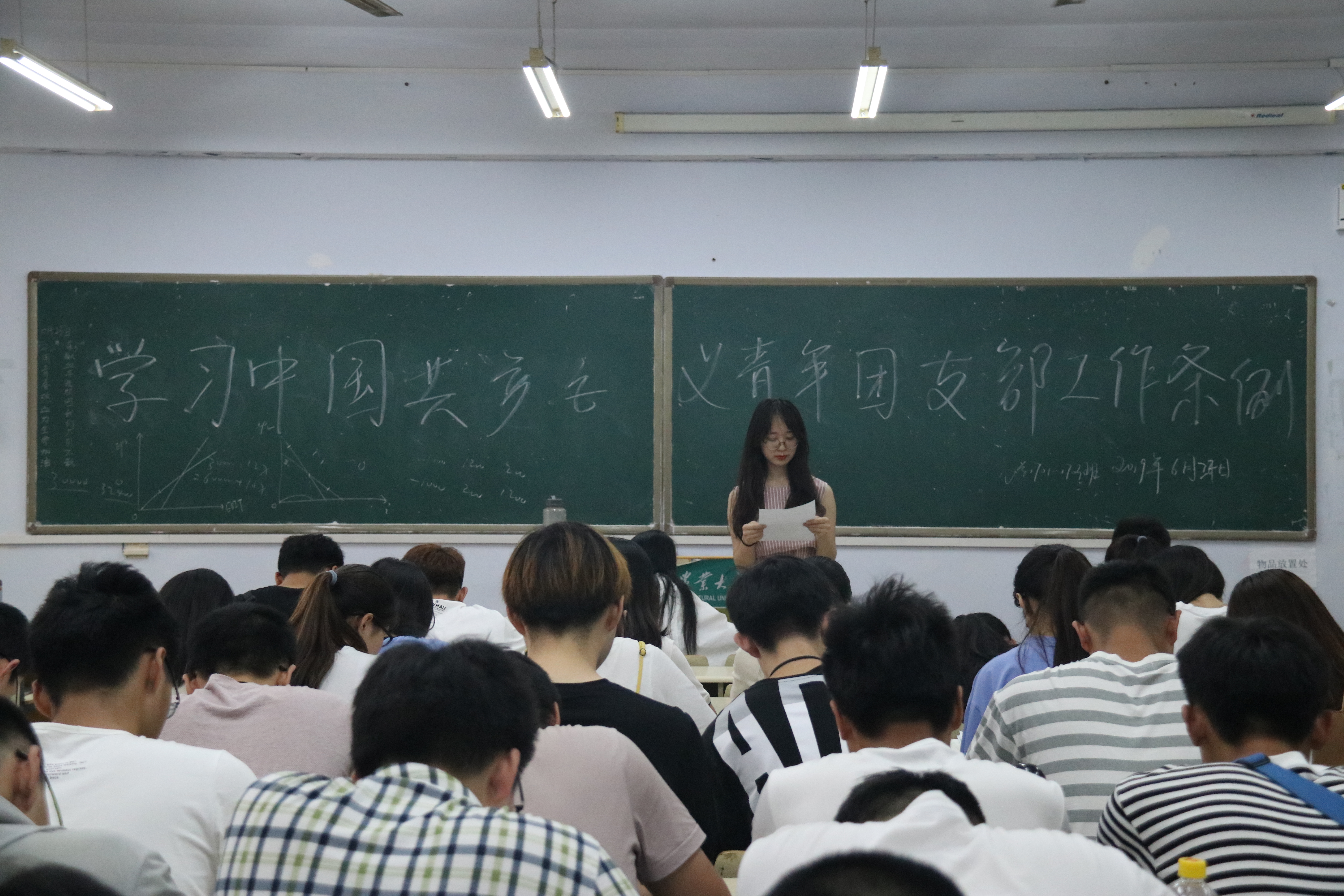6月23日,新葡萄8883官网amg于教学区开展“学习中国共产主义青年团支部工作条例”主题团课。2017、2018级团员参加。