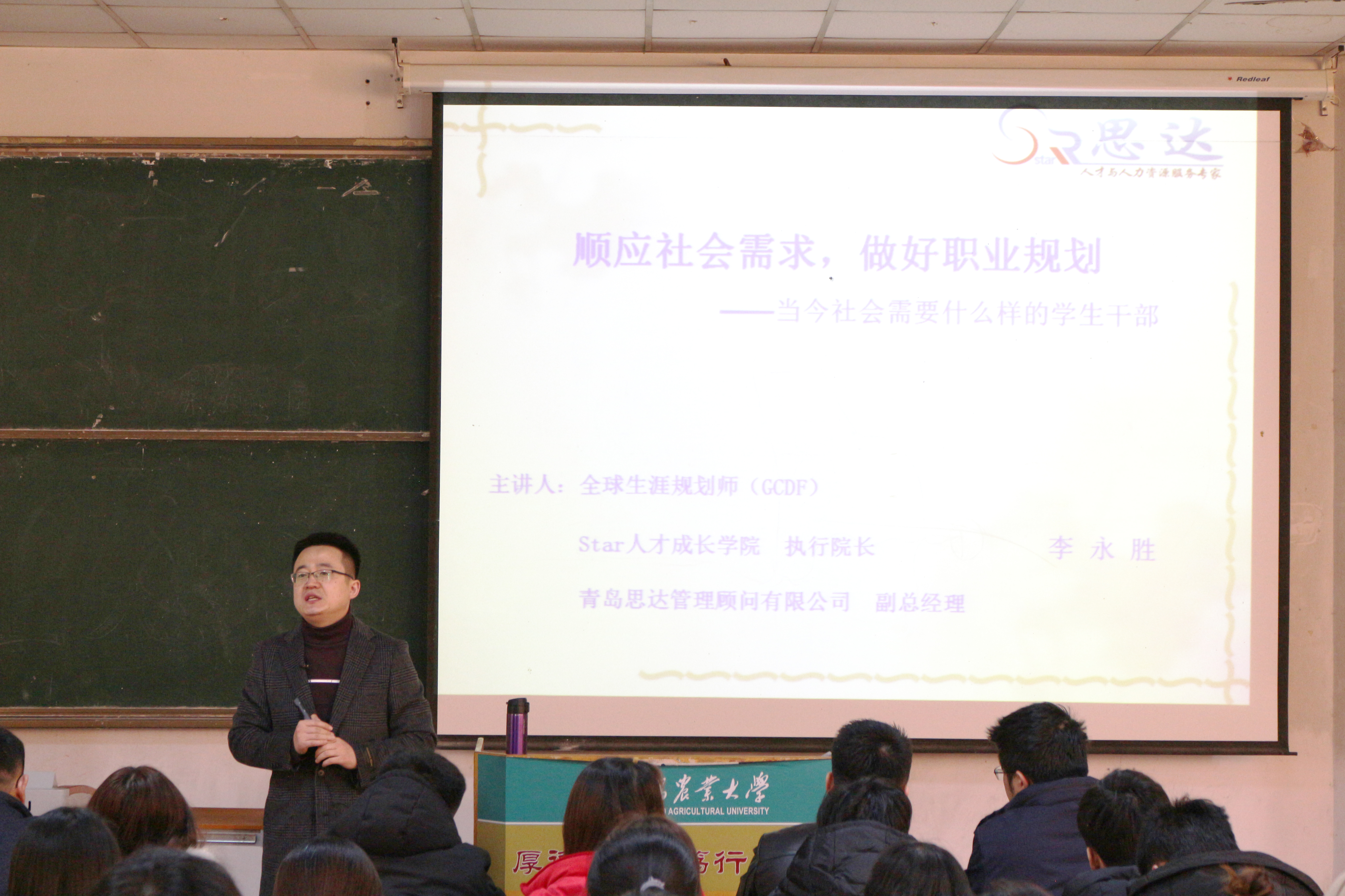 2月24日,新葡萄8883官网amg于教学区D区召开学生干部培训会。本次培训特邀全球生涯规划师、Star人才成长学院执行院长、青岛恩达管理顾问有限公司副总经理李永胜担任主讲,学院团委书记姜涛,辅导员谷元兴、刘宁和学生干部参加。