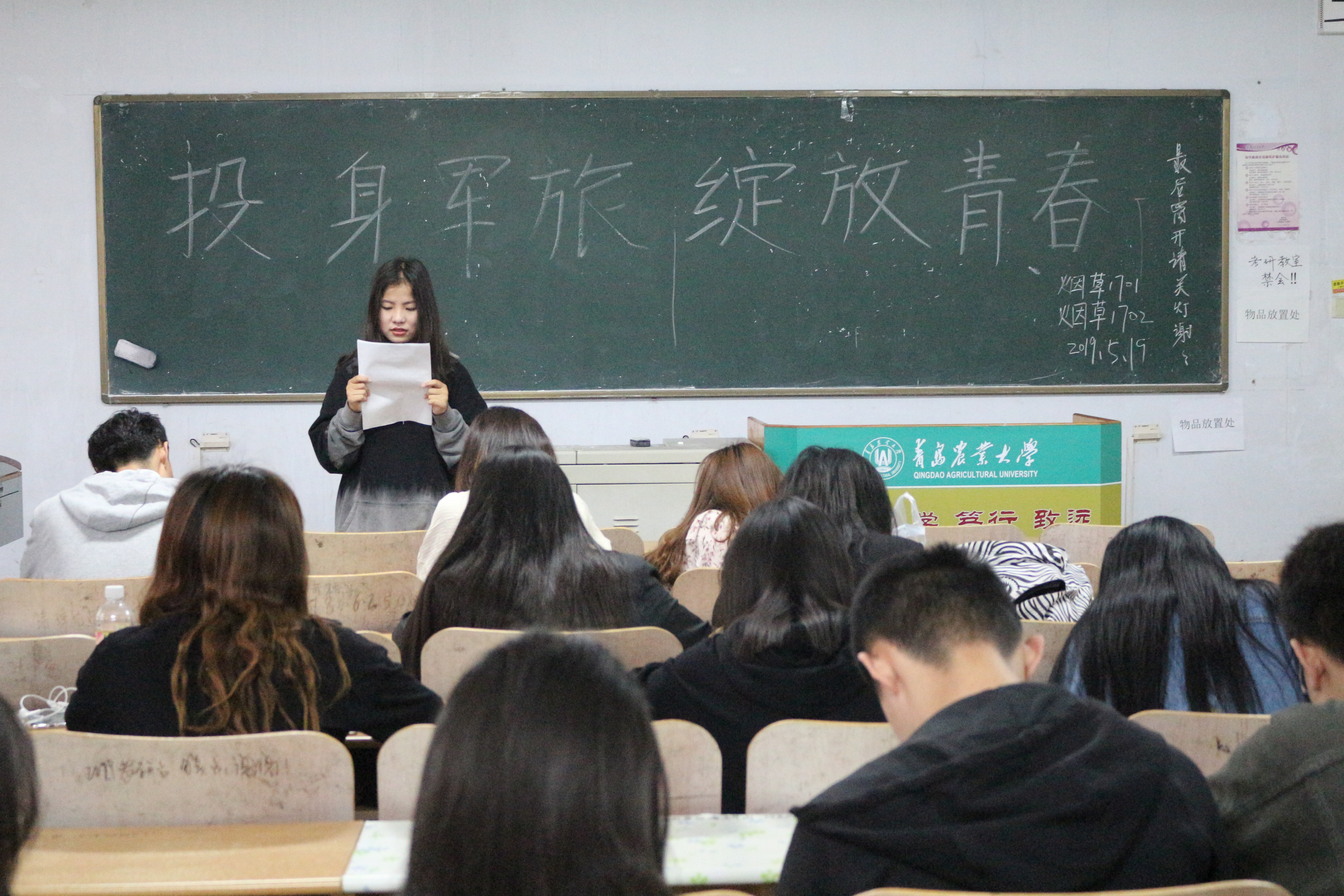 为响应习近平总书记提出的强军兴军伟大号召,鼓励当代大学生在军营中磨炼自我,5月19日,新葡萄8883官网amg于教学区开展“投身军旅,绽放青春”主题团课,学院2017、2018级全体同学积极参加。