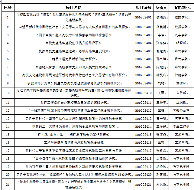 经全体教职工自愿申报,所在院(处、部)初审,科研处、党委宣传审核,学校批准,现公布哈尔滨华德学院2024年党建与思想政治教育专项研究课题立项结果如下: