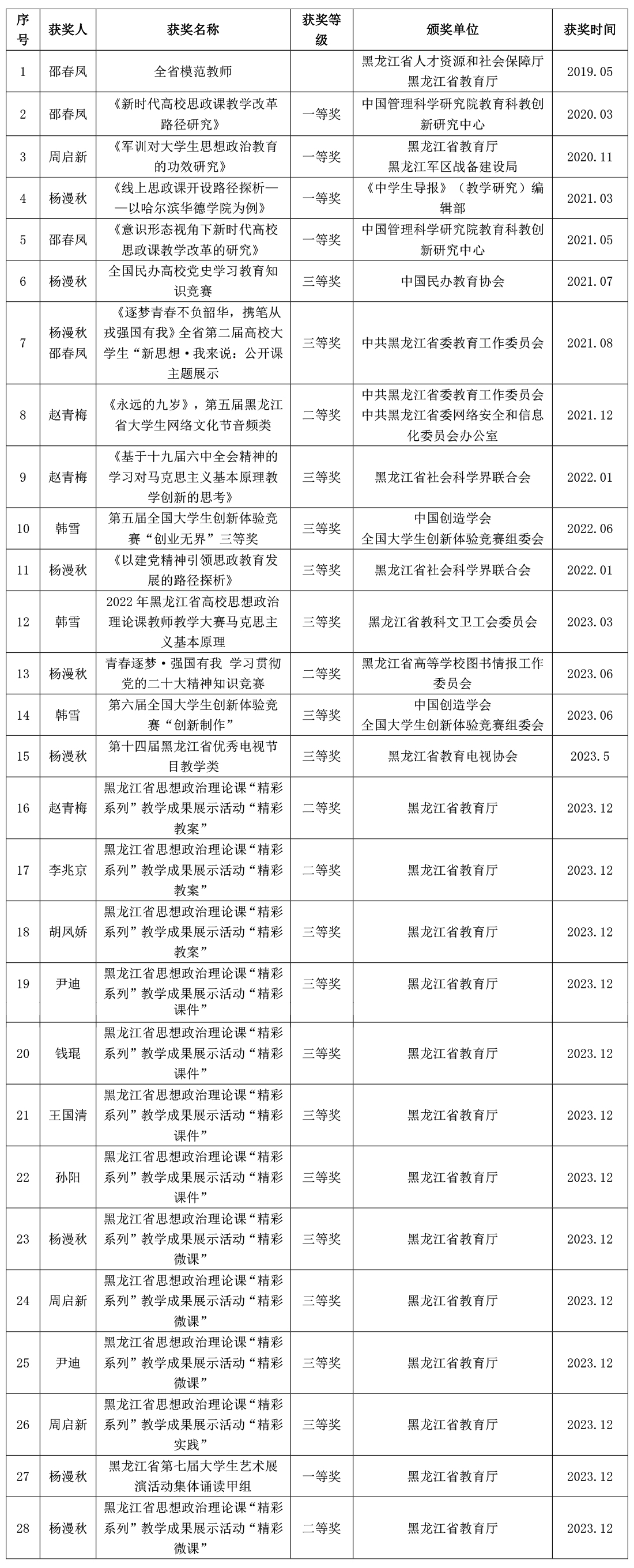 学院积极组织教师参加各级各类业务培训和实践研修,推荐优秀教师参加省“青教赛”、院校精彩课堂比赛和学院内教师教育教学能力竞赛。激发年轻教师创先争优、互帮互助的学习和工作氛围,教师的职业归属感和业务能力得到了有效提升。目前,学院教师已完成省级教改课题6项,现在研2项。自2019年以来,学院有11位教师28人次在全省高校思政课教师教学科研比赛中获奖。有1人获得黑龙江省“师德先进个人”和“模范教师”称号,学院两次获学校“师德建设先进集体”称号。