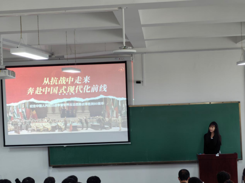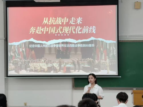 习近平新时代中国特色社会主义思想概论教研室则以“从抗战中走来 奔赴中国式现代化前线”为主题,以中国人民抗日战争暨世界反法西斯战争胜利80周年为契机,从历史回顾、抗战精神、当代传承和奔赴中国式现代化前线四个方面展开讲授,这使学生不仅加深了对抗日战争历史的了解,更在心灵深处种下了爱国主义的种子。学生们纷纷表示,通过老师系统地讲授,使他们明确了未来学习目标和奋斗方向,更激励他们要以实际行动为中国式现代化建设贡献青春力量。