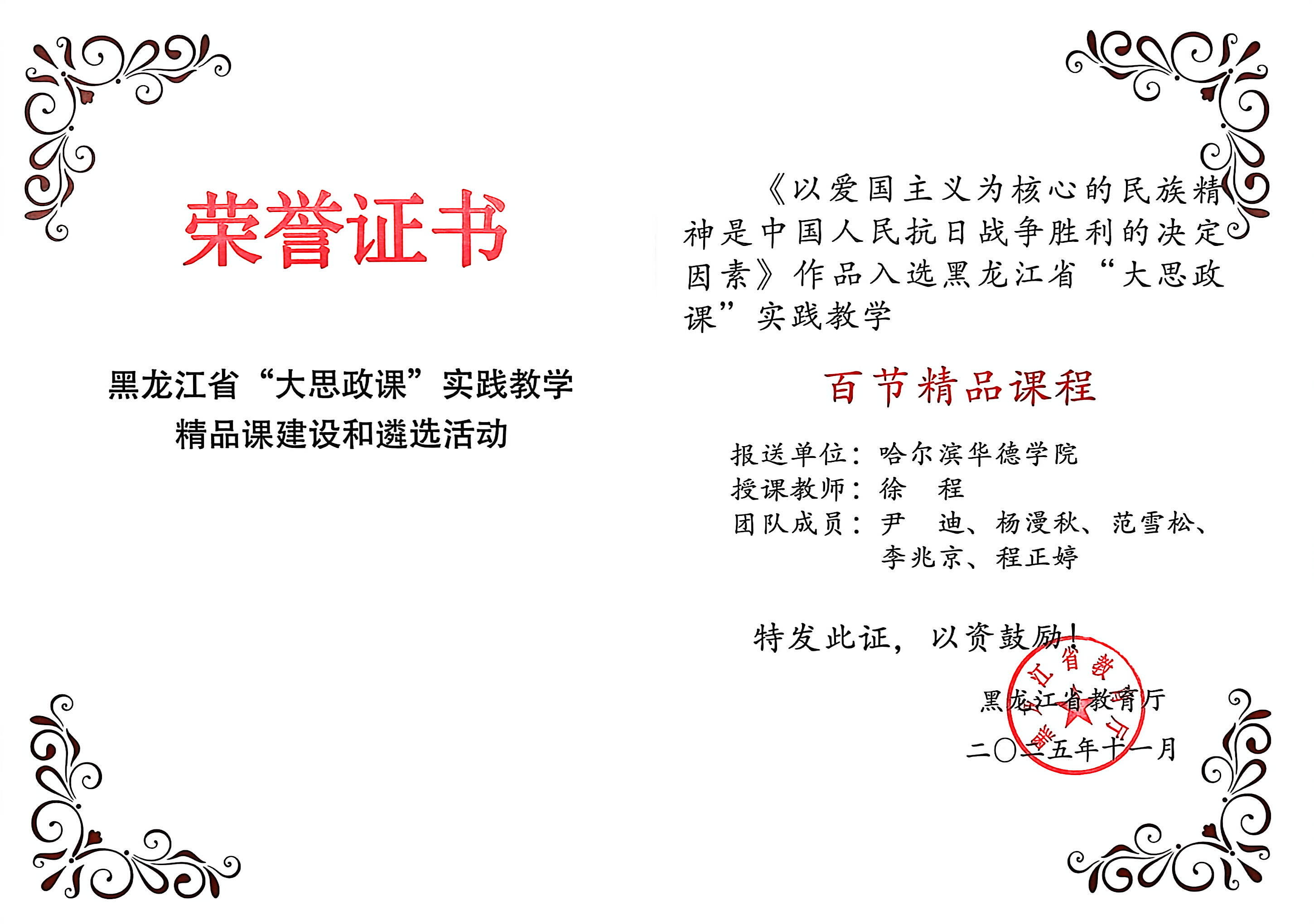 在省教育厅组织的习近平生态文明思想教学案例征集工作中,学院胡凤娇老师的《守护冰城生态 绘就哈尔滨民生幸福画卷》案例,成功入选黑龙江省高校思政课教学案例库,胡競兮老师参与了微课视频的录制工作。与此同时,在省级“大思政课”实践教学精品课程遴选中,学院徐程老师团队的《以爱国主义为核心的民族精神是中国人民抗日战争的决定因素》课程,入选了省级“百节精品课程”。