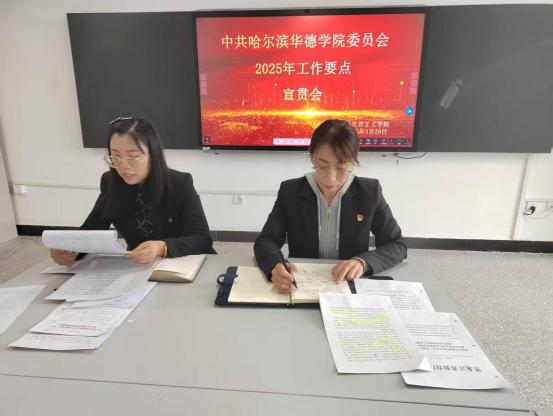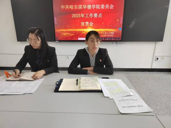 院长助理杨漫秋院长助理围绕《中共哈尔滨华德学院委员会2025年工作要点》的五部分内容即“强化政治领航,筑牢办学治校根本保证;聚焦立德树人,打造三全育人华德范式;夯实基层基础,激发党建工作创新活力; 深化融合发展,构建大党建协同格局;全面从严治党,营造风清气正育人生态”带领大家一起学习,结合学院实际,对如何贯彻落实“工作要点”精神进行了思想动员,使大家清晰了2025年的工作方向和工作目标。