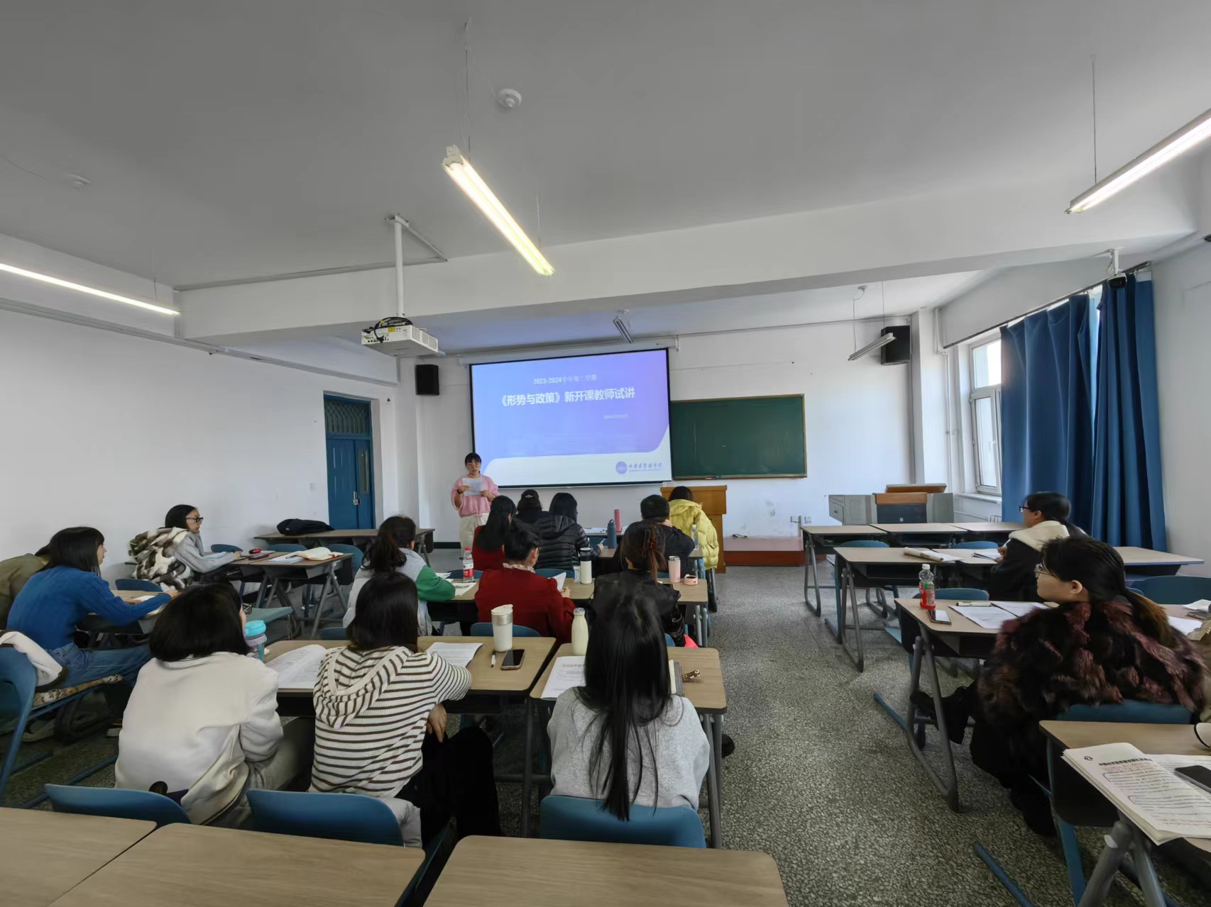 本学期《形势与政策》课新开课的11位老师按照抽签顺序分别进行试讲,教师们准备充分,表达流畅、逻辑清晰,展现出良好的教学能力。