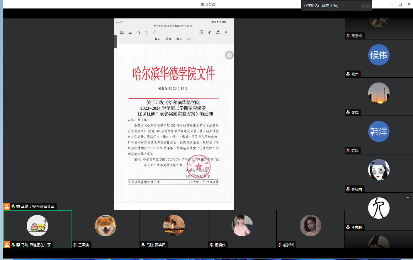 随后,中国近现代史纲要教研室副主任尹迪带领全体教师共同学习了《哈尔滨华德学院2023-2024学年第二学期精彩课堂“优课优酬”表彰奖励实施方案》,并从领导机构、工作目标、覆盖范围及对象、激励规则、表彰奖励时点、工作要求等方面对文件进行了详细说明。院长助理杨漫秋做了补充说明,强调要细致研读文件具体内容,保证人人学通文件、读懂方案。