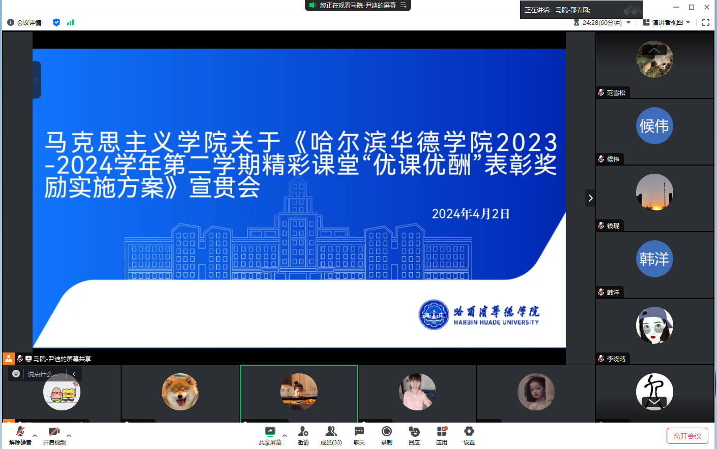 首先,邵春凤院长指出为进一步提升0BE导向的精彩课堂建设成效,提升精彩课堂教与学质量,提高学生“课前–课中–课后”学习投入度和成效,扩大我校精彩课堂表彰奖励覆盖面,使全体任课教师全面了解《哈尔滨华德学院2023-2024学年第二学期精彩课堂“优课优酬”表彰奖励实施方案》召开此次会议。