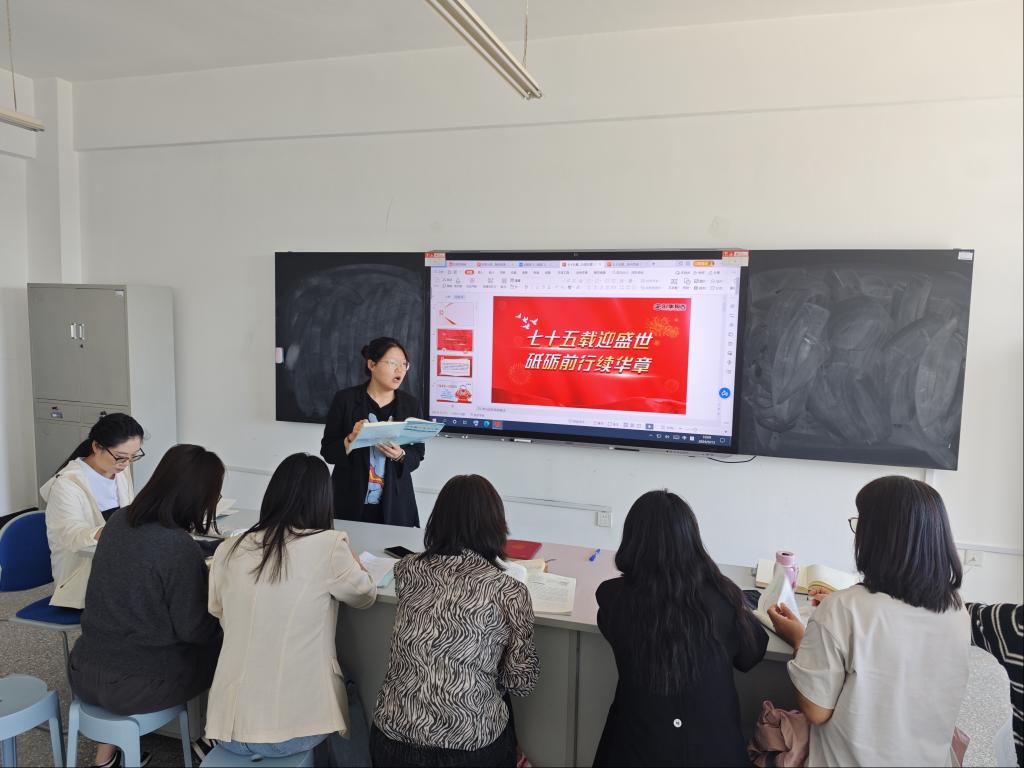 在备课环节中,陈姝凝老师针对新课程中的第一讲内容“七十五载迎盛世 砥砺前行续华章”进行了现场说课,分享了自己的备课思路和教学设计。随后,韩雪老师分享了自己对于本节教学内容、教学重难点的认识,对案例选取和课程导入环节的设置提出了具体建议,提示全体教师需要注意合理分配课堂教学时间,对于教材和课件中体现的数据和材料,要有选择性的展开,详略得当。对重大问题和重要政策要讲清楚历史背景、发展历程以及党和国家的原则立场。